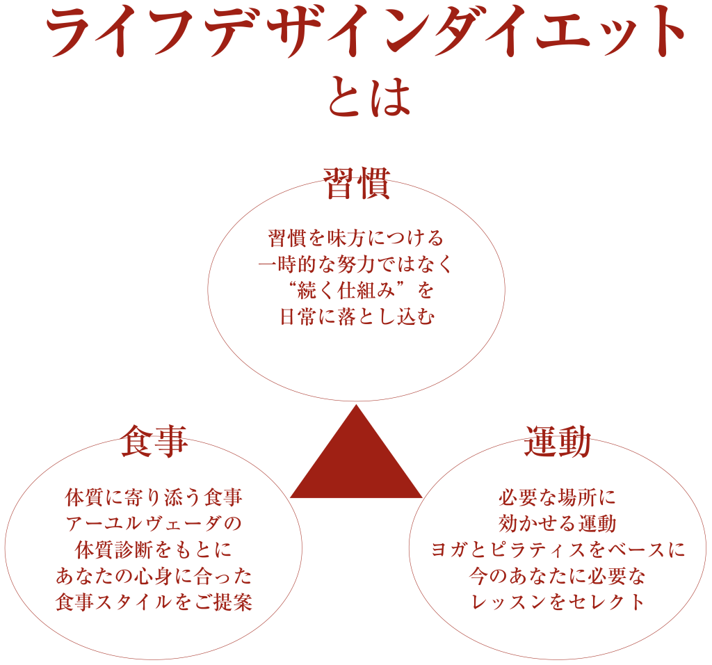 ヨガやアーユルヴェーダの東洋の考え方をベースにおくことで、ストレスも解放しながら、 心地よく痩せていき、美しさを取り戻してもらう。
